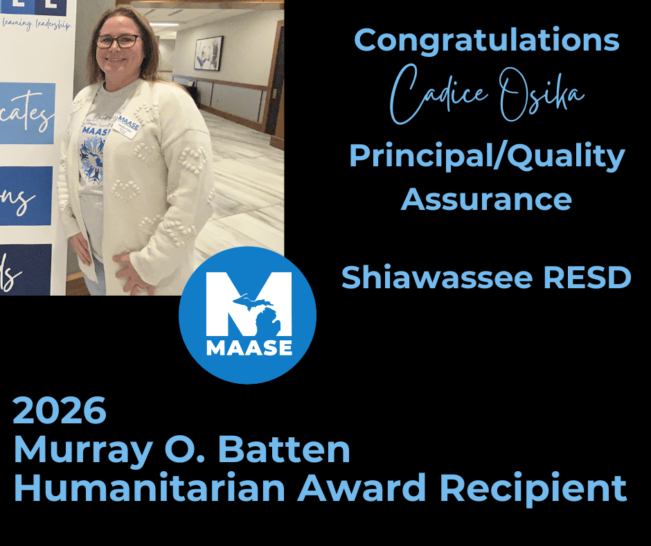 The Murray O. Batten Humanitarian Award is named in honor of Murray O. Batten, former Director of Special Education in the Michigan Department of Education. Candidates are selected with an emphasis on the characteristics exemplified by Mr. Batten; Leadership, Honesty, Integrity and Dedication. This prestigious award is presented annually at the February MAASE meeting. The Batten Award was first presented in 1984.